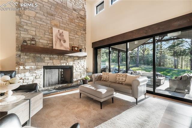 The gourmet kitchen is a chef's dream with SMART Thermador appliances, a built-in Miele coffee maker, Alderwood island with leather granite, touch faucet, instant hot water, double ovens, beverage fridge, and a walk-in pantry with a second fridge hookup. Enjoy intimate meals in the formal dining room or cozy nook. Retreat to the luxurious main-level Owner's Suite with heated floors, rainfall shower, leather-finished counters, and custom California closet. Two additional bedrooms share a stylish bath, while a spacious loft above the garage offers a private guest suite with wet bar and beverage fridge. Additional highlights include a finished 4-car garage with 8' doors, office with custom printer closet and built-ins, dual-zone heating, A/C, whole-house humidifier, Cat-5 wiring, and Class 4 impact-resistant shingles. Hot tub, Sonos sound, custom furnishings, and select built-ins included. Located minutes from Monument's shopping, dining, and recreation, with community access to golf, trails, and parks--this home is truly a refined Colorado retreat.